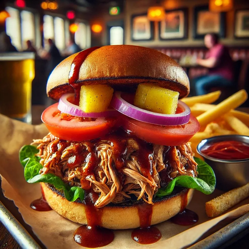 Tender, pulled chicken** simmered in our jerk BBQ sauce* with lettuce, tomato, onion and pineapple