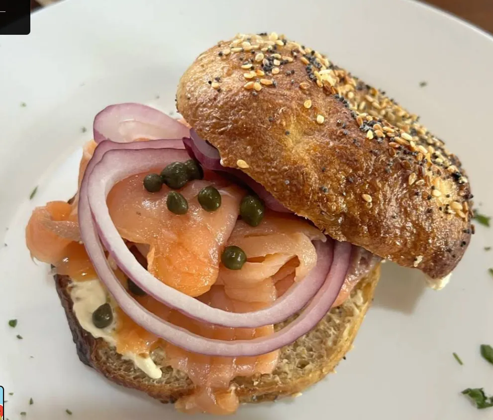 Fresh Baked Bagel* with Smoked Salmon, Fresh Dill and Lemon Cream Cheese*, Red Onion, and Capers