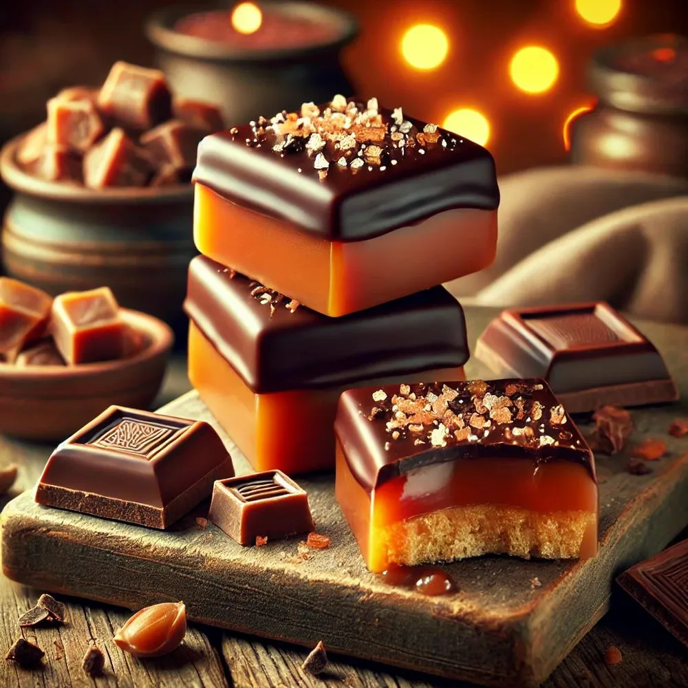 Homemade Caramel Squares covered with 60% Dark Chocolate