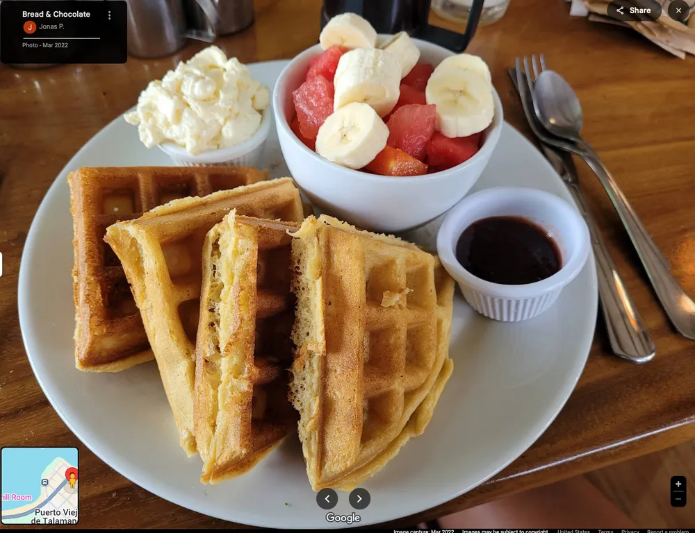 Rich and buttery waffles* served with fresh whipped cream* and strawberry sauce*. Optional add-ons: cup of fruit, chocolate sauce*