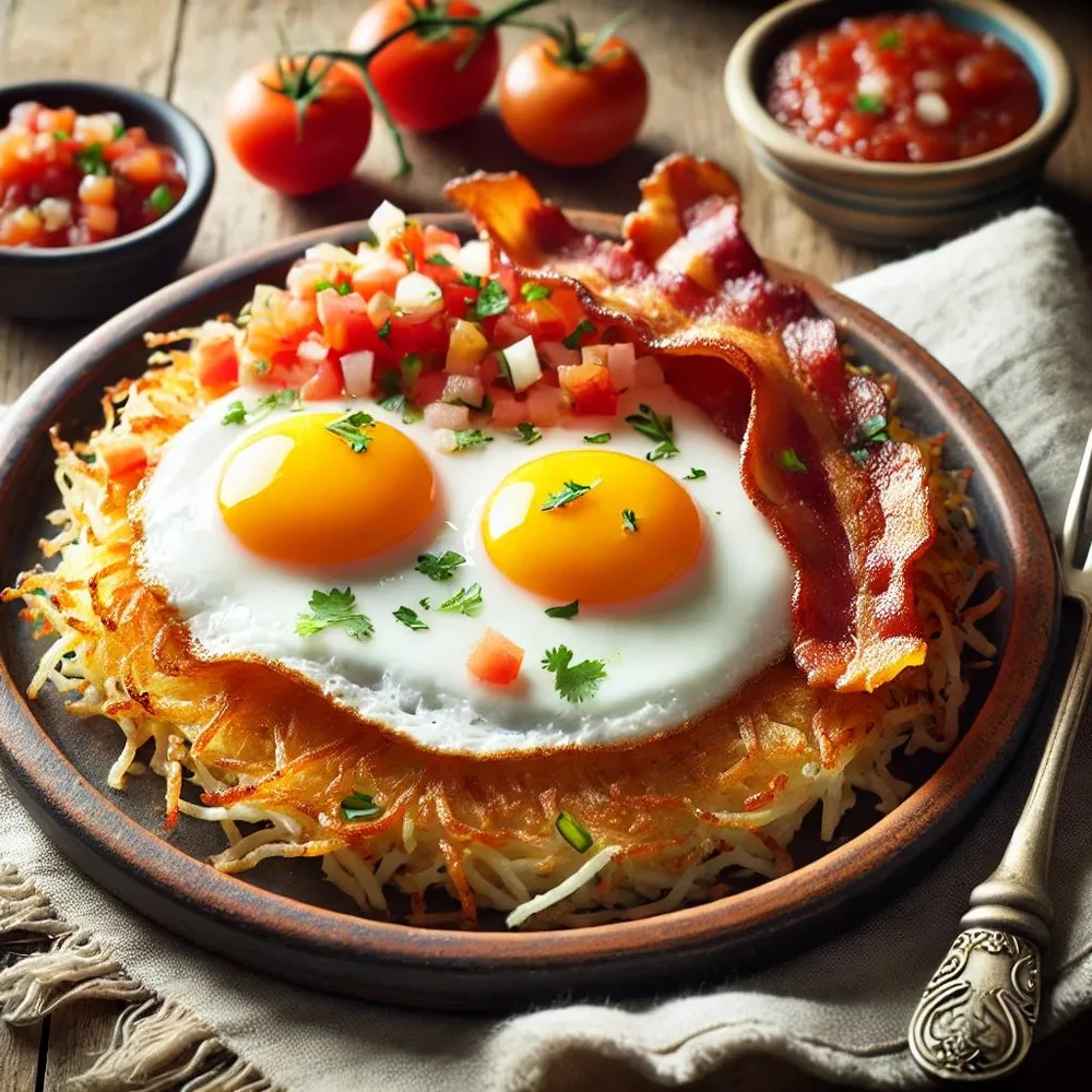Two fried eggs, bacon & homemade salsa on a bed of hash browns in butter.
