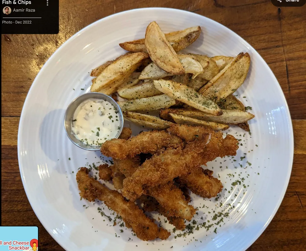 Crispy pices of fish fillet marinated and Panko breaded. Accompanied by fries and house tarter sauce.