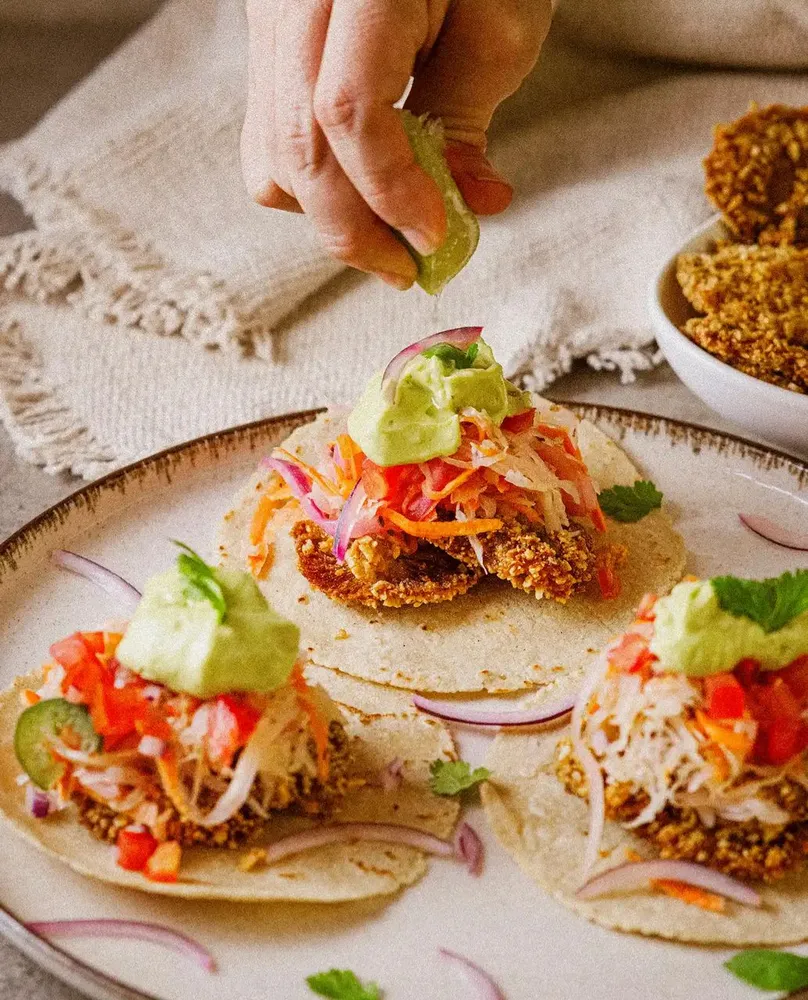 3 Corn tortillas* filled with our crispy oyster mushrooms, topped with pico de gallo, cabbage slow, pickled onions and avocado served with choice of one ofour house sauce