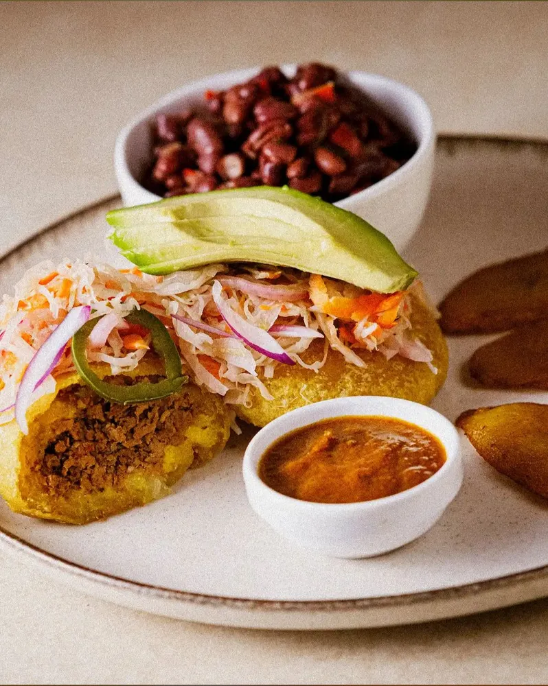 Mashed yuca patty, filled with vegan meat, topped with cabbage slow, avocado and our coconut caribbean sauce with a side of house beans and sweet piantain