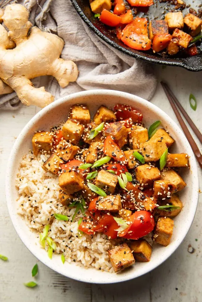 Mixed veggies in soy sauce, ginger, almonds come with rice