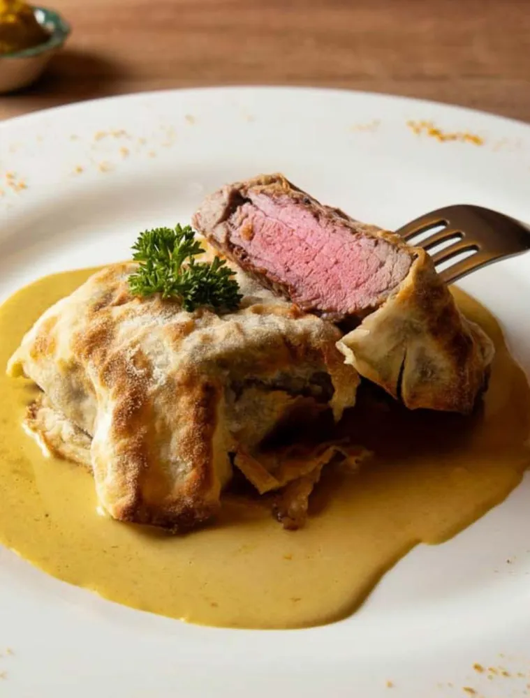 Premium Beef Tenderloin in a Creamy Mustard and Worcestershire Sauce, Wrapped in a Sheet of Pastry served with Roasted Potatoes and Homemade Bread