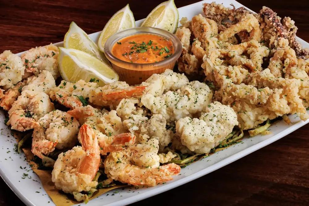 Fried Shrimps, Squid, Fish of the Day, Fried Shredded Zucchini and Mediterranean Sauce