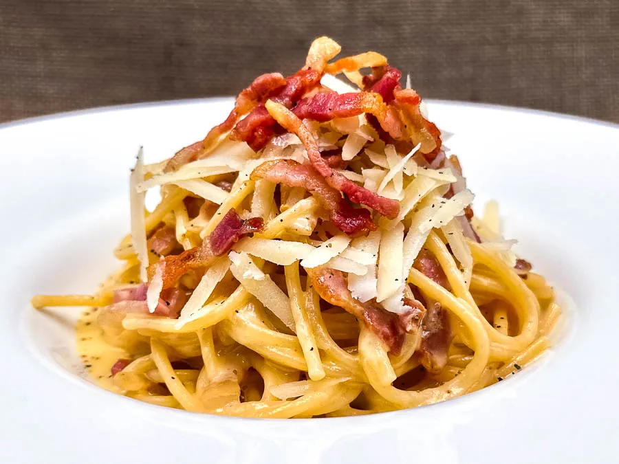 In a Fresh Creamy Egg Sauce with Tuscan Pancetta, Parmesan Cheese and Black Peppe