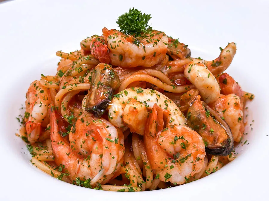 In a Fresh Tomato Sauce with Shrimps, Squid and Mussels