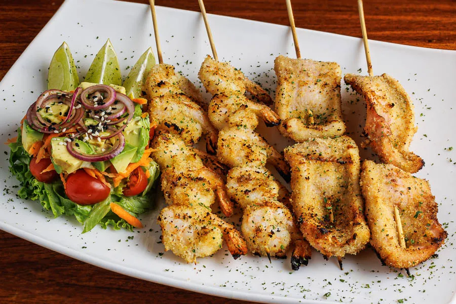 Grilled Shrimps and Squid Flavored with Garlic, Parsley and a pinch of Bread Crumbs with Fresh Salad and Homemade Bread