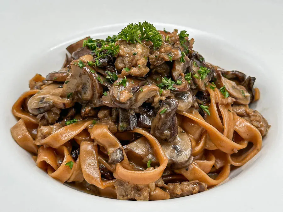 In a Creamy Sauce With Homemade Sausage, Fresh Mushrooms and Italian Porcini Mushrooms