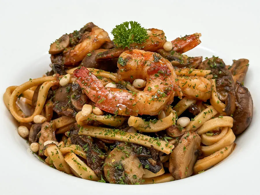 In a Fresh Tomato Sauce with Shrimps, Fresh Mushrooms, Italian Porcini Mushrooms and Pinenuts