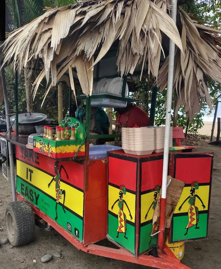 Take it Easy is the coolest food truck by the beach in Cocles, just outside Puerto Viejo. Known for homestyle Caribbean rondón, curries and veggie options, it’s pure good vibes with reggae and hammocks on the sand.